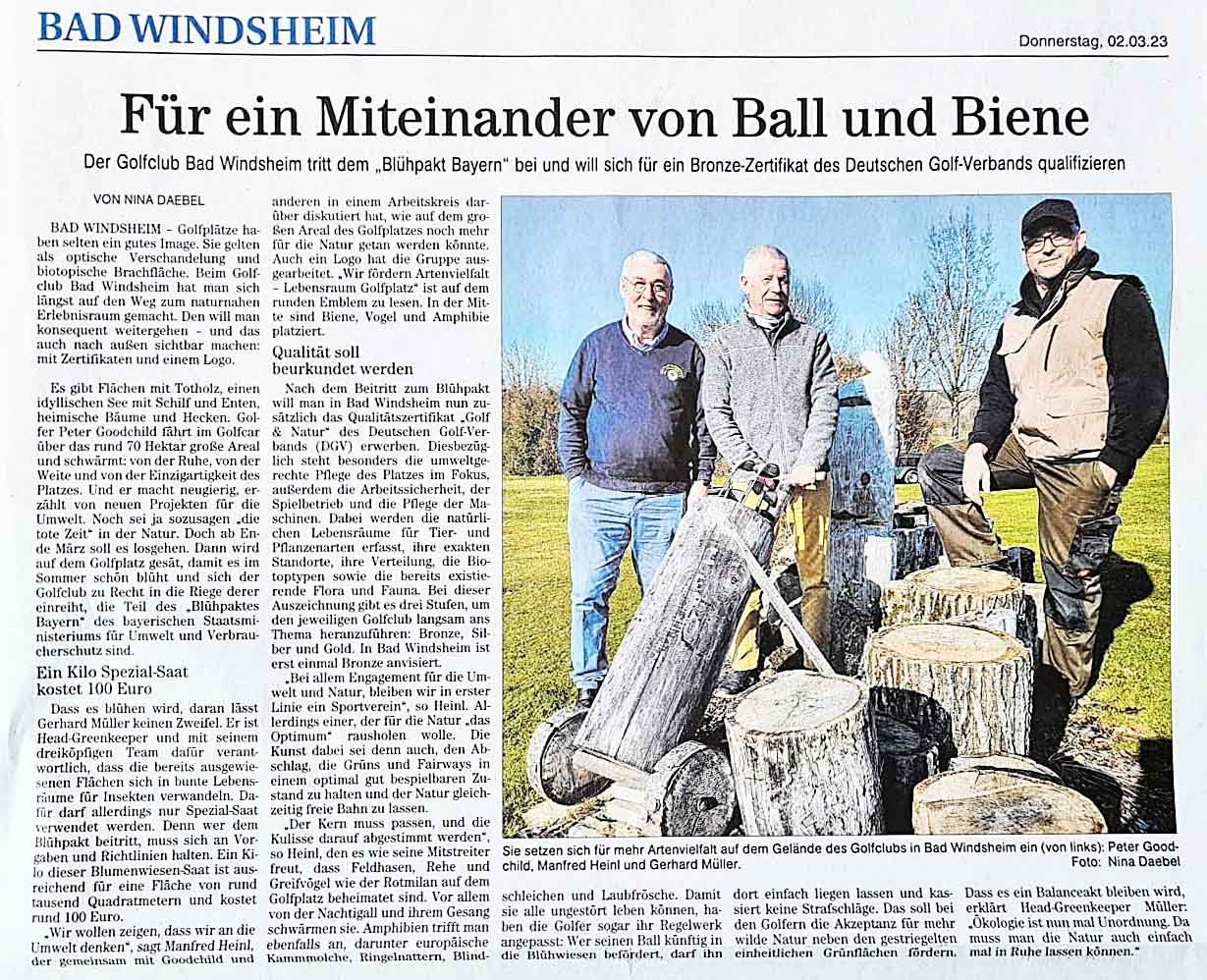Am 1. August 2023 wurde der Golfplatz des Golfclubs Reichsstadt Bad Windsheim e.V. nach jahrelanger guter Vorarbeit von Gerhard Müller und Manfred Heinl in den Blühpakt Bayern aufgenommen.